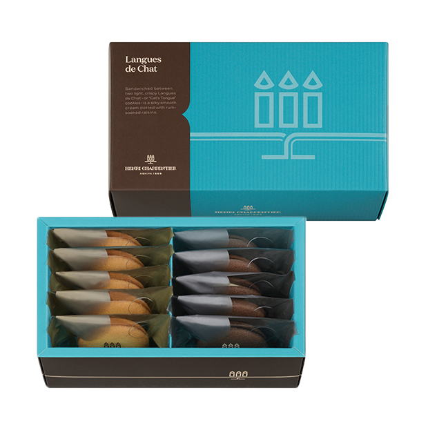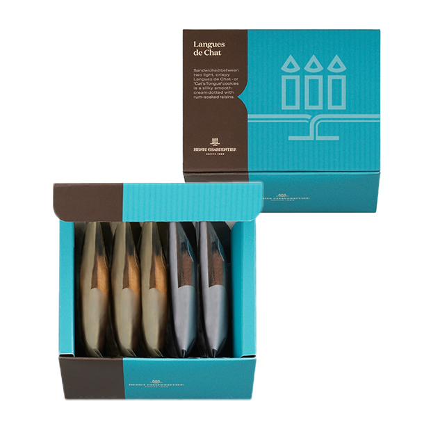 The cookie is a slightly sweet baked treat for adult tastes. Langues de Chat (cat’s tongue) is a thin, baked cookie filled with cream mixed with highly aromatic rum raisin.