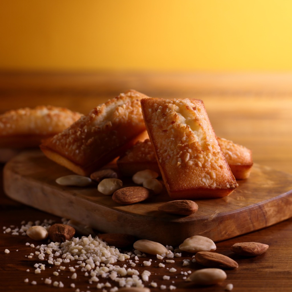 プレーン味のシチリア産アーモンドのフィナンシェにさらにシチリア産アーモンドをクラッシュしてトッピングしたフィナンシェ。