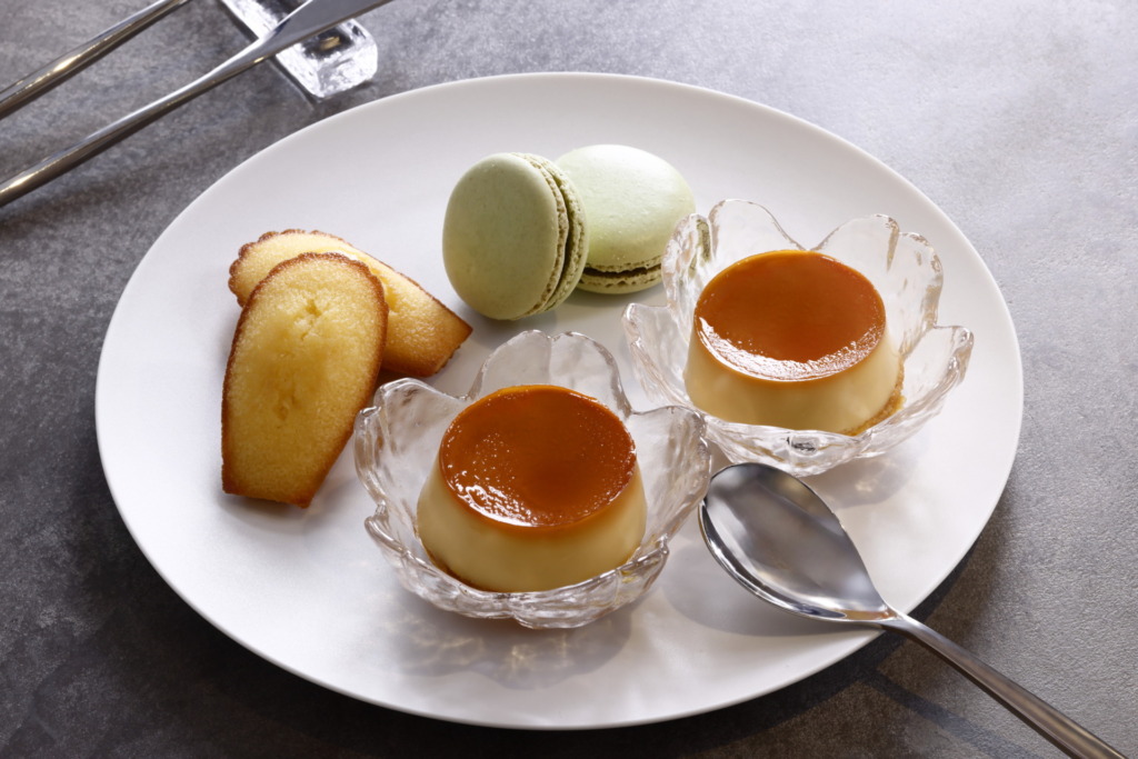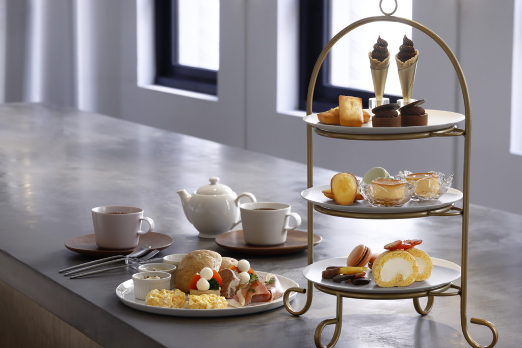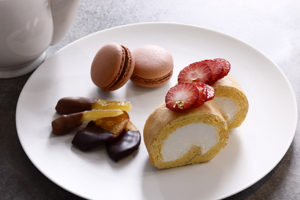 フィナンシェやマドレーヌといったフランスの代表的な焼き菓子に加え、ベルギーの文化を反映したショコラ、スイスが発祥とされるロールケーキなど、多彩なデザートをティースタンドに美しく盛り込みました。