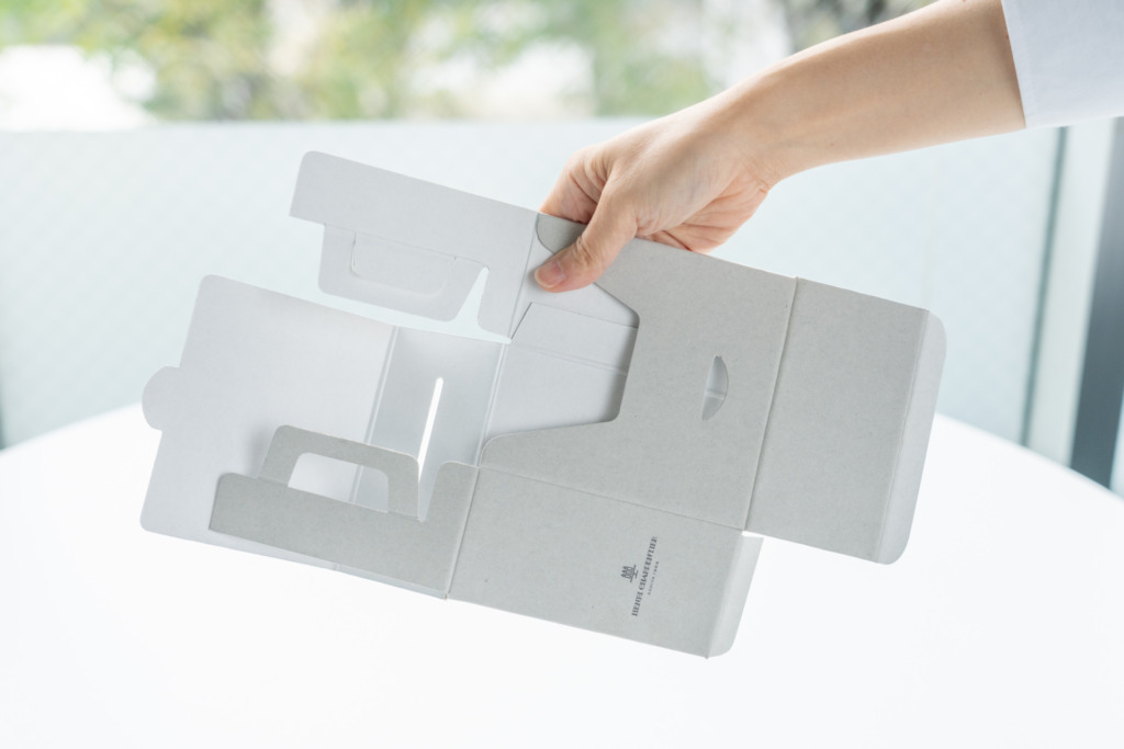 パッケージには、古紙を70%以上使用した段ボール素材を採用。再利用可能な素材を用いることで、包材のエコ化を図っています。さらに、包材の軽量化にも配慮した設計としました。また、お客様から寄せられた「箱を捨てるのが大変」という声に着目し、箱は4ステップで簡単に折りたたんで捨てることができる構造としています。手提げ袋分の資源に配慮し、箱に持ち手をつけることで、ショッパーを使用せずに持ち運べる仕様にいたしました。