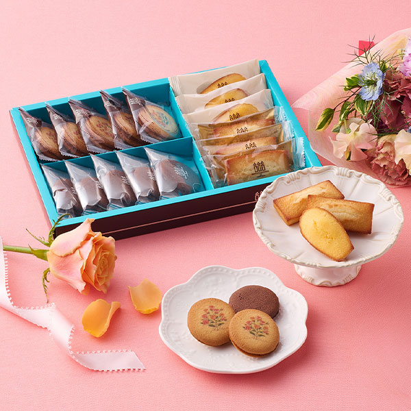 【内容】フィナンシェ3個、マドレーヌ3個、ラング・ド・シャ(フードプリント)〈Thank you Mother〉5個、〈チョコレート〉5個、イニシャルミニタオル(M/Y/A/S/N/R/Kの全7種類)1枚、メッセージカード1枚