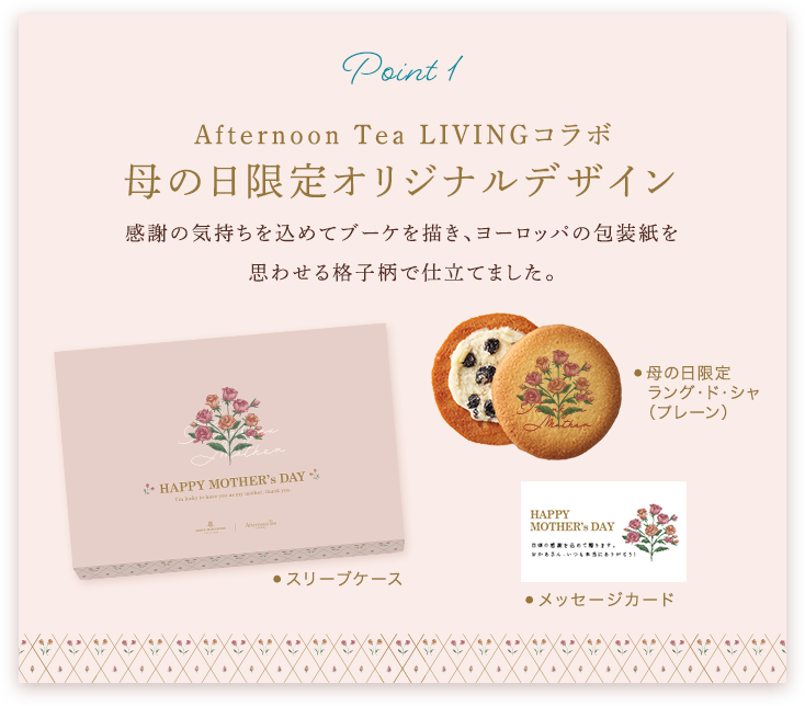 また、オンラインショップ限定商品として、Afternoon Tea LIVING の人気ミニタオルを詰め合せた特別ギフトや、ブーケミニタオル付きの「ラング・ド・シャ・アソート」の予約も開始しております。