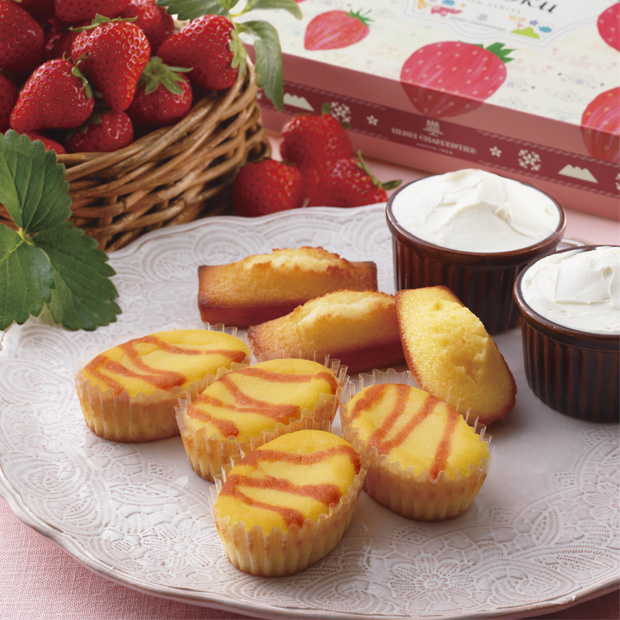 しっとり焼き上げたクリームチーズのまろやかさと、宮城県のいちご※の甘酸っぱい香りが楽しめるチーズケーキ「ケーク・フロマージュ<フレーズ>」と、アンリ・シャルパンティエ自慢のフィナンシェとマドレーヌをセットにしました。