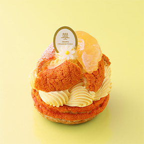 フランスの伝統的なケーキ『パリ・ブレスト』を、可愛らしくアレンジしました。 鮮やかなオレンジ色が特徴です。 みずみずしい柑橘とお花をあしらい、春の訪れを感じるようなデザインにしました。 天面にはフレッシュの柑橘を使用し、中にはオレンジ風味のクリームにカスタードクリーム、柑橘やヨーグルト風味のジュレを絞り、なめらかでコクがありつつもさっぱりとした味わいのケーキに仕上げました。