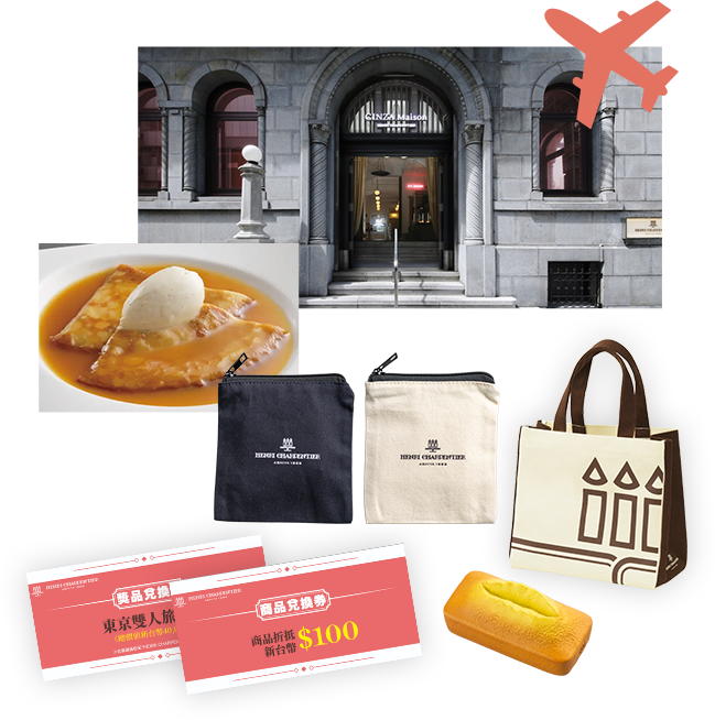 抽中特獎可享受日本東京之旅(三天兩夜,附住宿&機票),還能到HENRI CHARPENTIER的主店鋪──銀座Maison──體驗特別的甜點。此外,還預備獨創小袋、托特包或可愛的磁鐵貼等驚喜禮品。